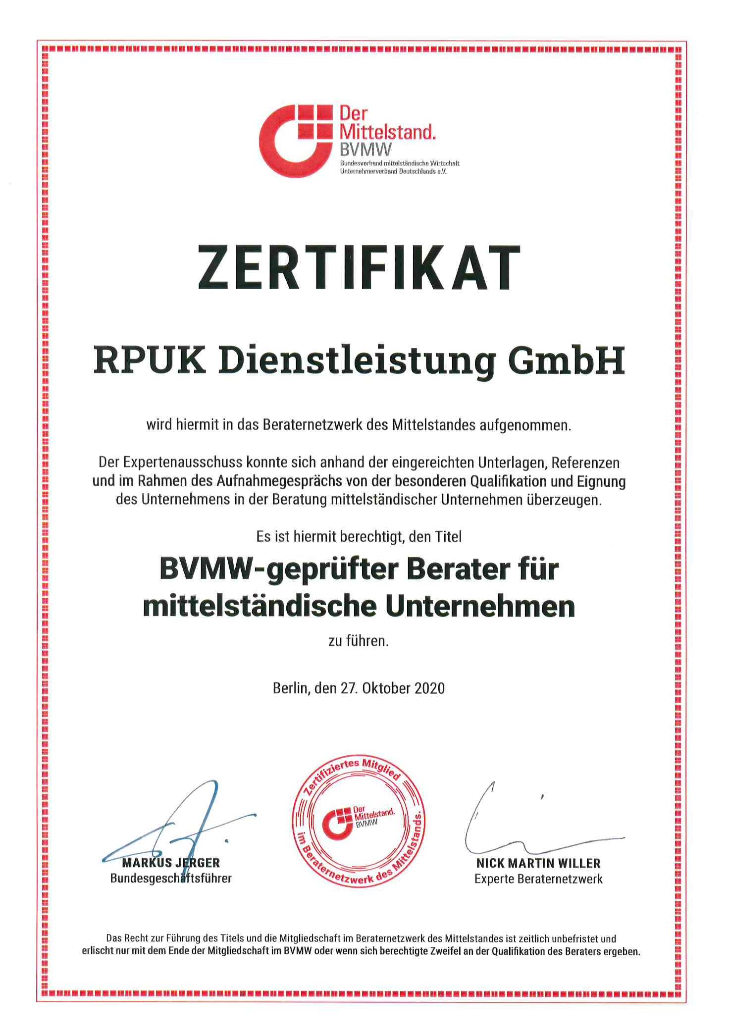 Ein wichtiger Faktor dabei ist die Unternehmensberatung. Deswegen hat der BVMW das Beraternetzwerk Mittelstand gegründet. Dies soll Unternehmern als Orientierungshilfe bei der Suche nach qualifizierten Beratern dienen."